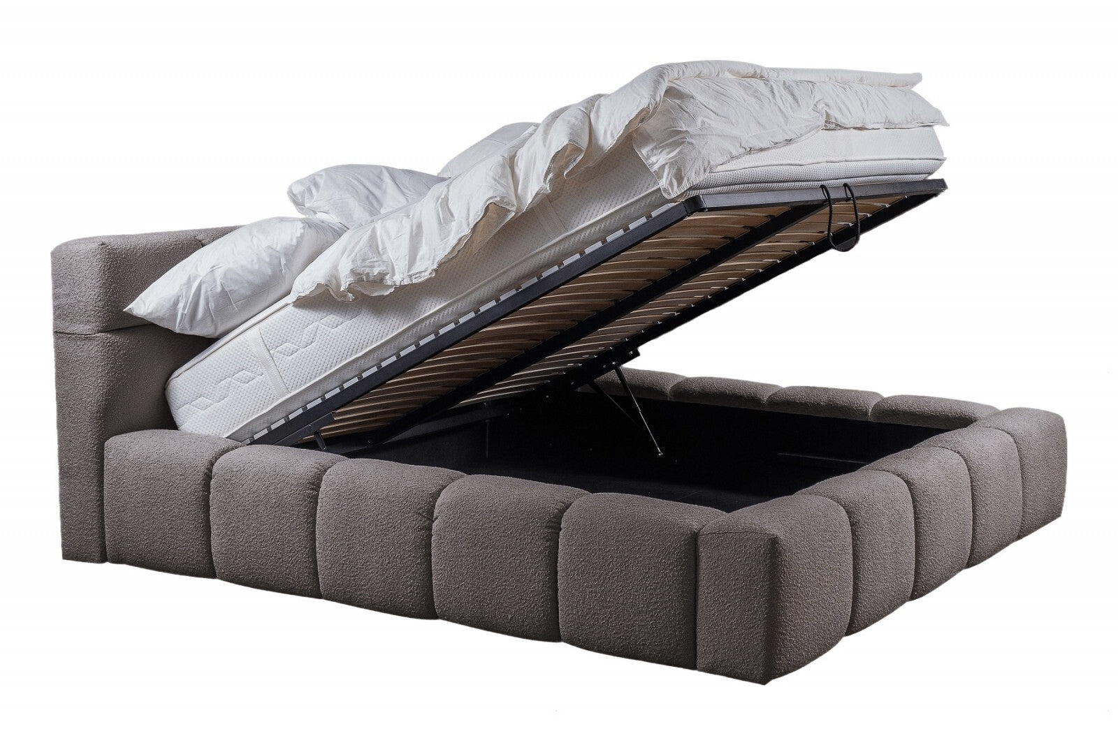 Le lit contient un cadre de lit rabattable grâce au système de vérin à gaz, permettant l'accès au coffre de rangement.