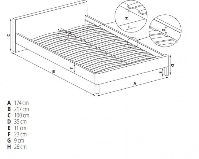Pour le matelas 200 x 160 cm : Longueur : 217 cm, largeur : 174 cm, hauteur de tête : 100 cm
