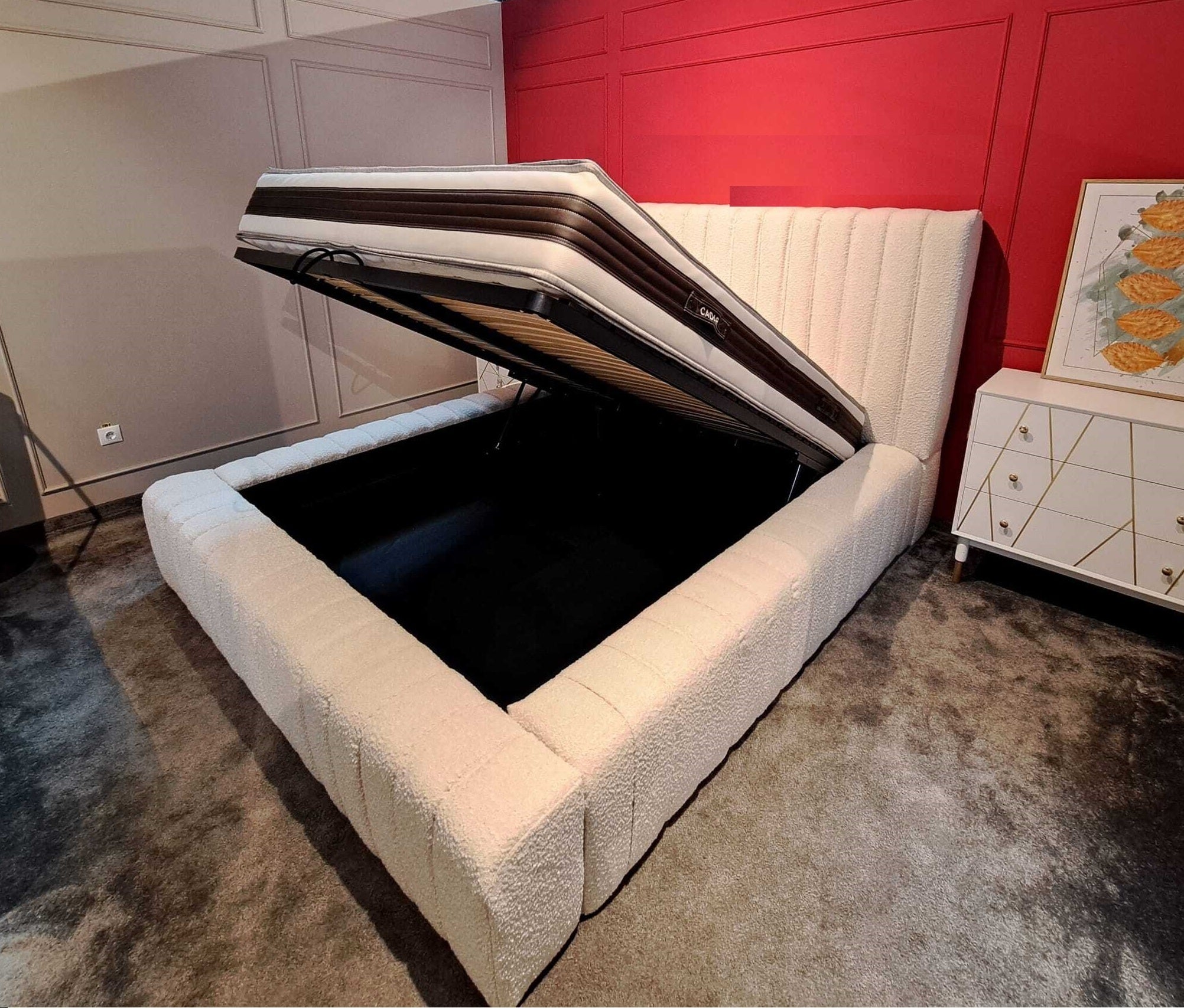 Lit rembourré en tissu, Cadre de lit pliant avec espace de rangement, Lugano, Beige