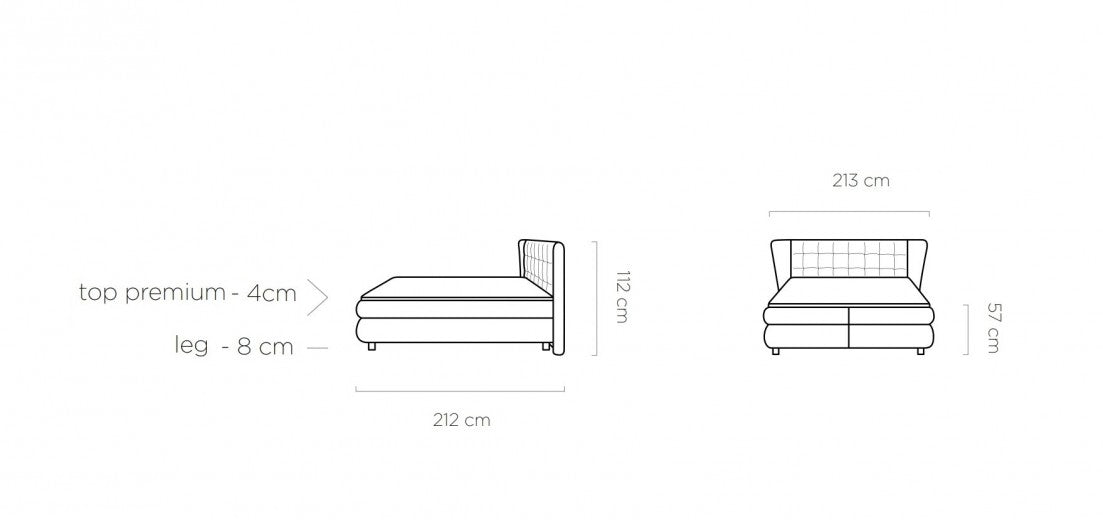 Pour le matelas 200 x 160 cm : Longueur : 212 cm, largeur : 213 cm, largeur tête : 233 cm, hauteur tête : 112 cm