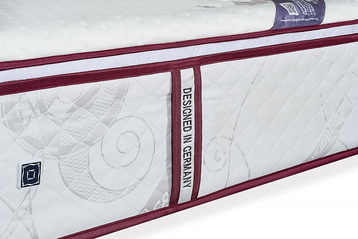 Ce matelas a une housse Made in Germany et est compacté sur un support textile en laine volumique anti-allergique, d'une densité de 1000g/m2. Dans le surmatelas de surface, il y a une couche uniforme de 4 cm d'EuroLatex. La housse extérieure est faite d'un mélange de viscose et de coton. La bande latérale est matelassée avec une bande de polyuréthane de 6 mm, munie d'aérateurs des deux côtés. Ce matelas est également muni de poignées pour tourner le matelas.