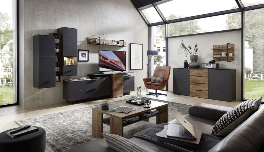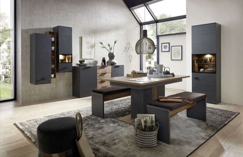 La collection Madeline est spécialement créée pour aménager un salon ou une salle à manger moderne et élégant, construit avec une attention particulière aux détails. La multitude de détails élégants associés aux tons blanc, chêne et gris foncé souligne le caractère original de cette collection.