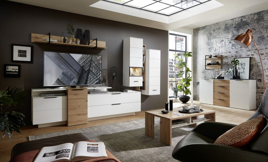 La collection Madeline est spécialement conçue pour aménager un salon ou une salle à manger moderne et élégant, construit avec une attention particulière aux détails. La multitude de détails élégants associés aux tons blanc, chêne et gris foncé souligne le caractère original de cette collection.