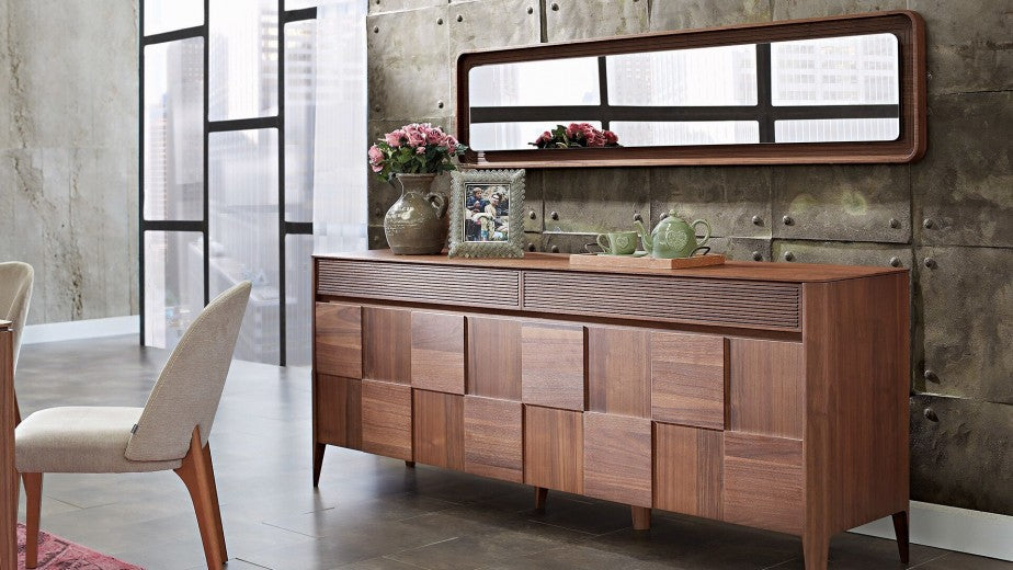 Le miroir Noble s'intègre parfaitement dans votre salon et crée un effet visuel fort.