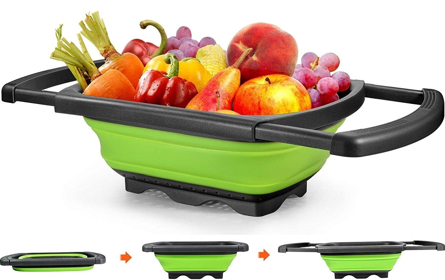 - 1 passoire pliante pour l'évier, avec anses extensibles : longueur : 39 cm, longueur avec anses rallongées : 60 cm, largeur : 26,5 cm, hauteur : 4,3 cm