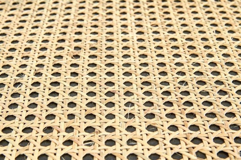 La table basse est en MDF laqué, rotin naturel et bois.
