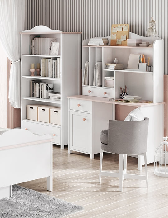 La collection Luna est la solution idéale pour ceux qui veulent un intérieur spacieux et moderne. La subtile combinaison de blanc et de rose poudré fait que la table de bureau attire l'attention des amateurs de contes de fées de tous âges.