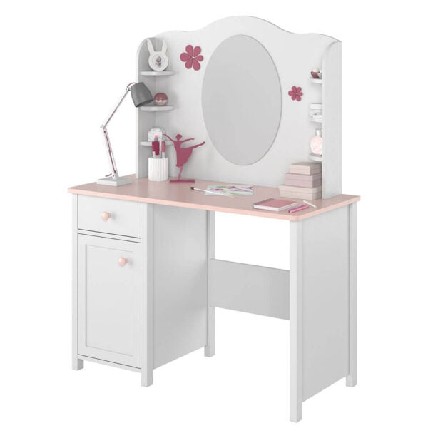 Table de bureau en bois, avec 1 tiroir et 1 porte, pour enfants et jeunes, Luna 03, Blanc/Rose, L110x52xH76 cm