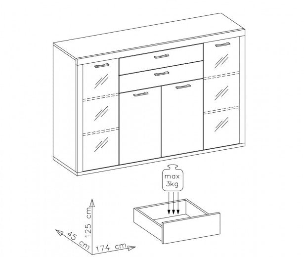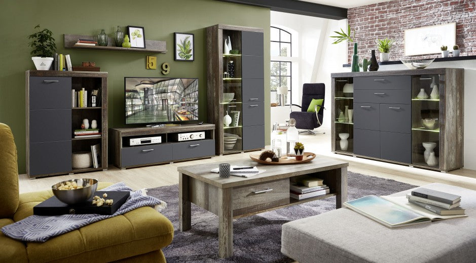 Vitrine en aggloméré et MDF, avec 4 portes et 2 tiroirs Krone Graphite / Natur, l174xA45xH125 cm